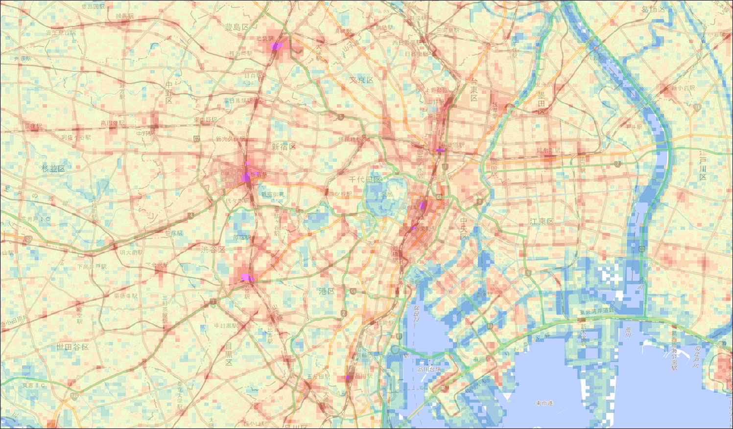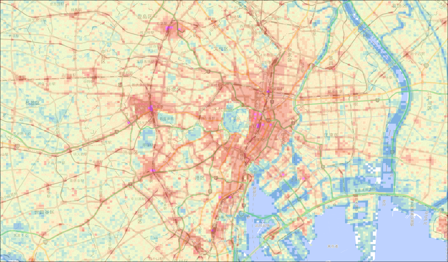 - 夜間人口、平日と休日の昼間人口、昼間と夕方~夜の人口の比較で地域性をパターン化でき、認識が容易になります。