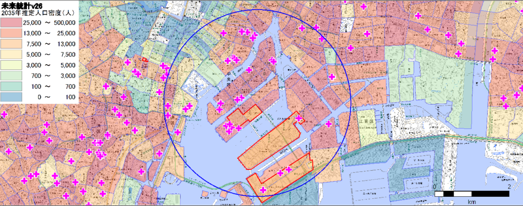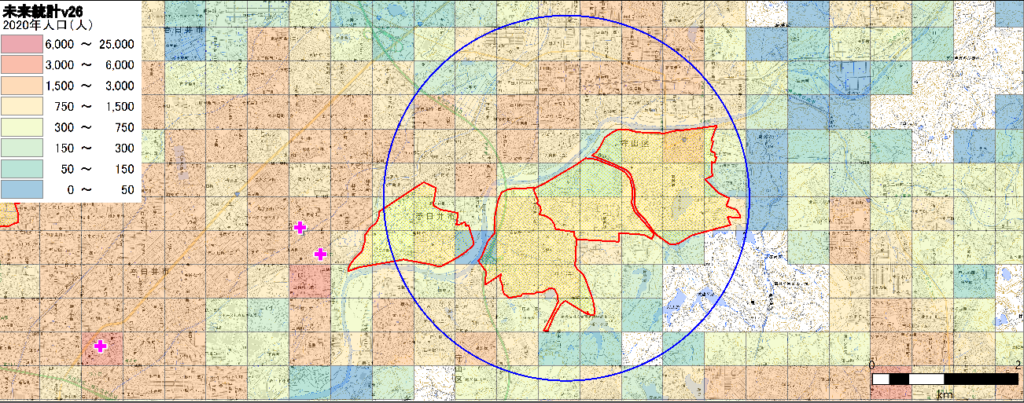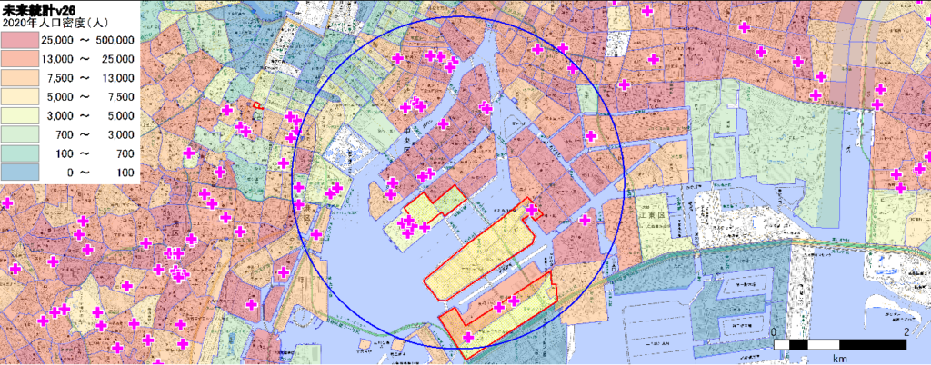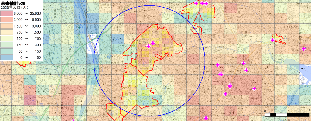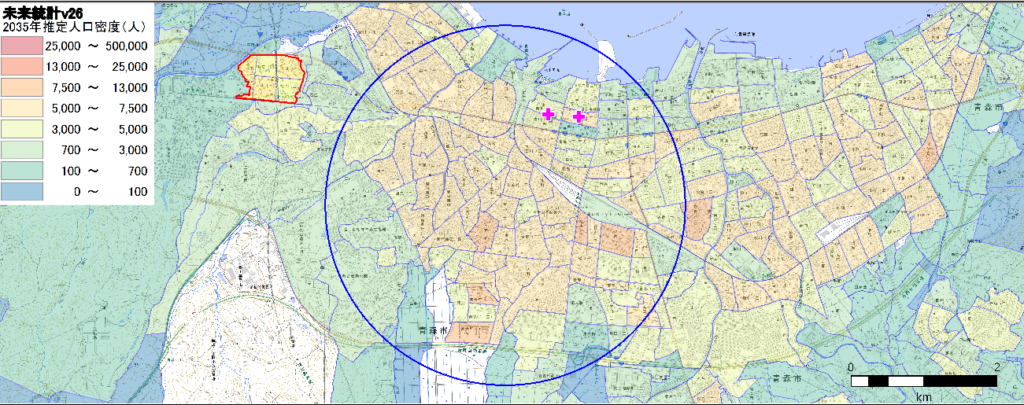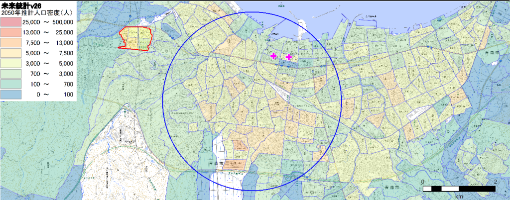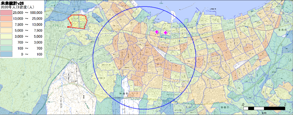 青森駅や青森県庁を含む半径2km強のエリアに90000人ほどの人口が集積していることがわかります。